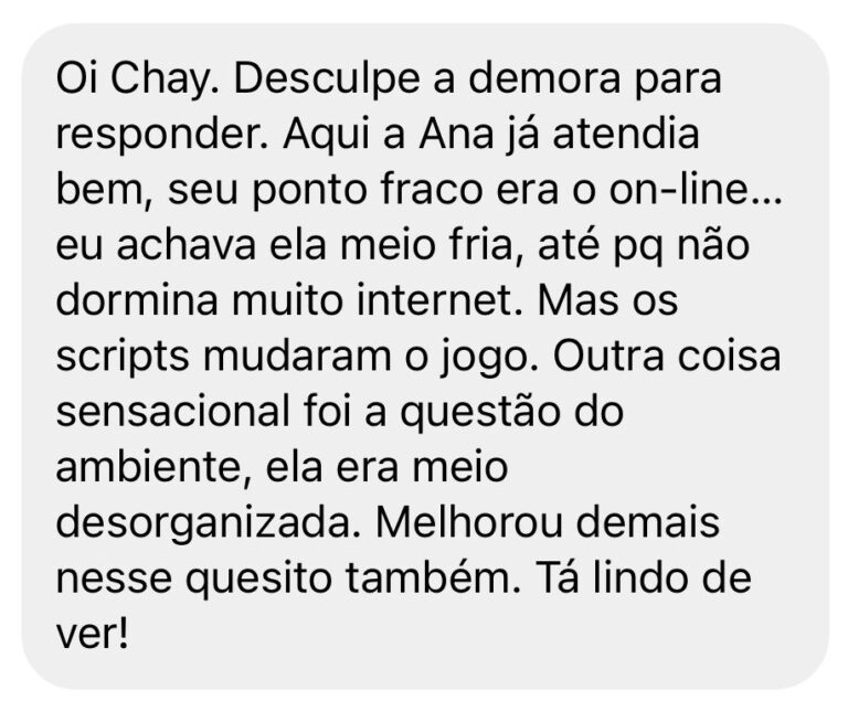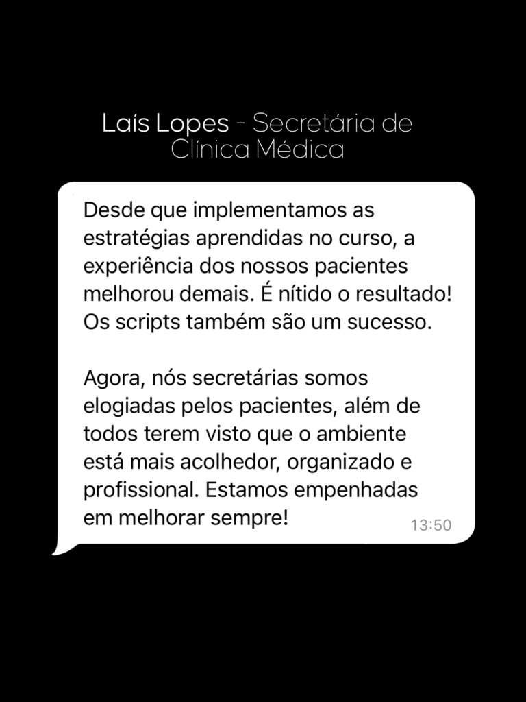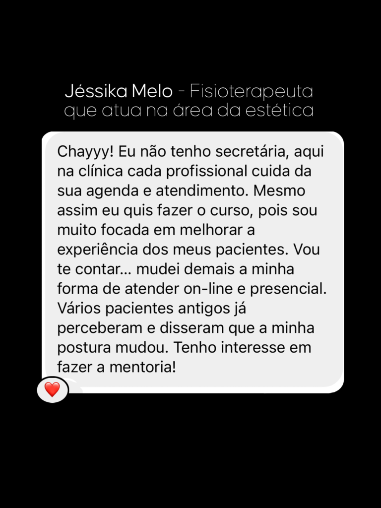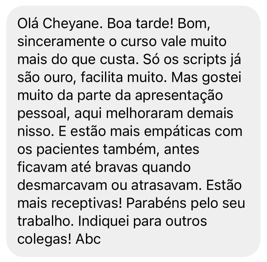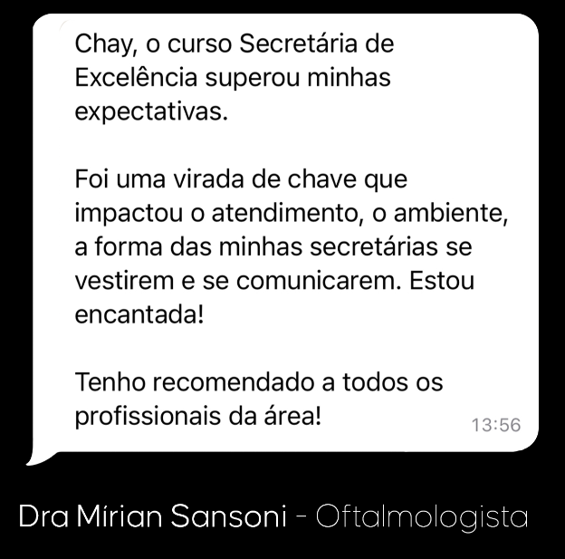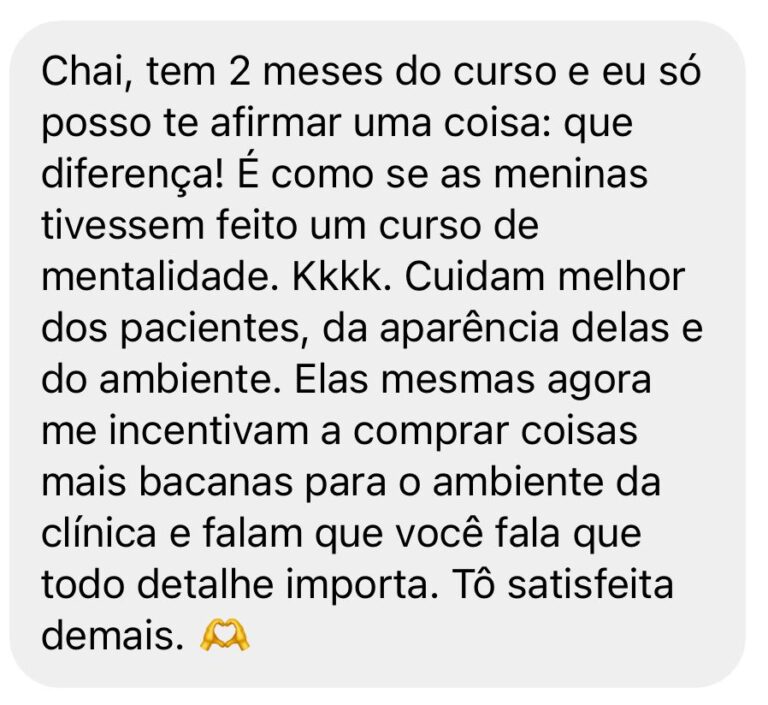 Oi, eu sou a Chay! Sou formada em Marketing e, nos últimos dez anos, dediquei minha carreira a ajudar clínicas e consultórios a oferecerem um atendimento de excelência. Já treinei mais de 100 secretárias, transformando o atendimento delas em algo que encanta os pacientes e fideliza clientes.